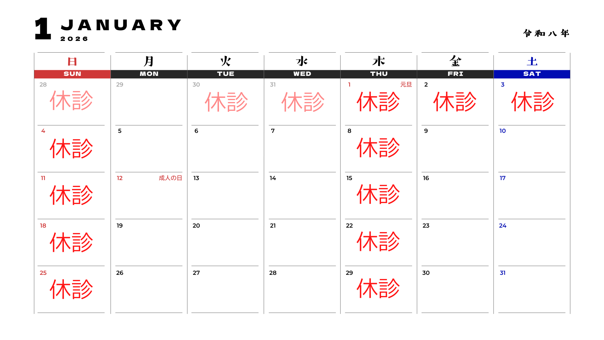 令和8年1月の休診日 2025 12/02 お知らせ 2025-12-02 ※年末年始は30日(火)から新年4日(日)まで休診とさせて頂きます。 以上となります。 お知らせ 記事をシェアしてね! URLをコピーする URLをコピーしました! URLをコピーしました! 令和7年12月の休診日 年末のご挨拶と休業日のご案内 関連記事 令和8年3月の休診日 2026-02-04 令和8年2月の休診日 2026-01-14 新年あけましておめでとうございます。 2026-01-01 年末のご挨拶と休業日のご案内 2025-12-30 令和7年12月の休診日 2025-11-05 新メニューのご案内|目と耳から整える鍼治療 2025-10-06 令和7年11月の休診日 2025-10-04 令和7年10月の休診日 2025-09-06